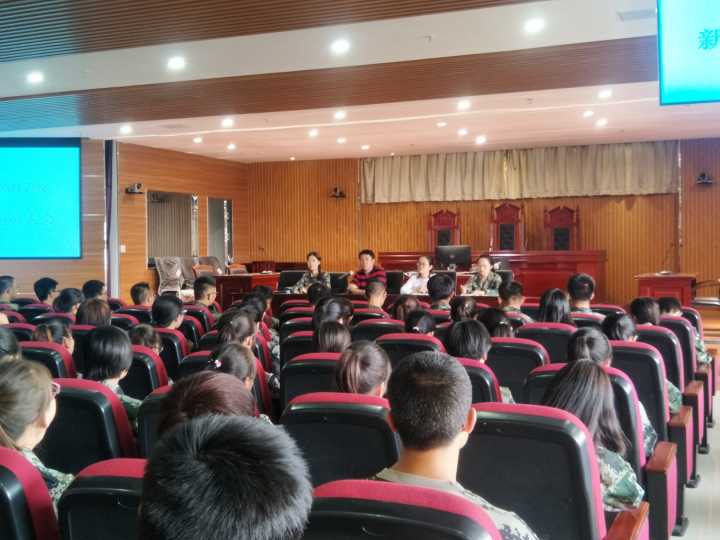 在文荟楼模拟法庭组织召开2017级新生军训动员大会,学院党委副书记崔明堂、辅导员老师出席本次会议。