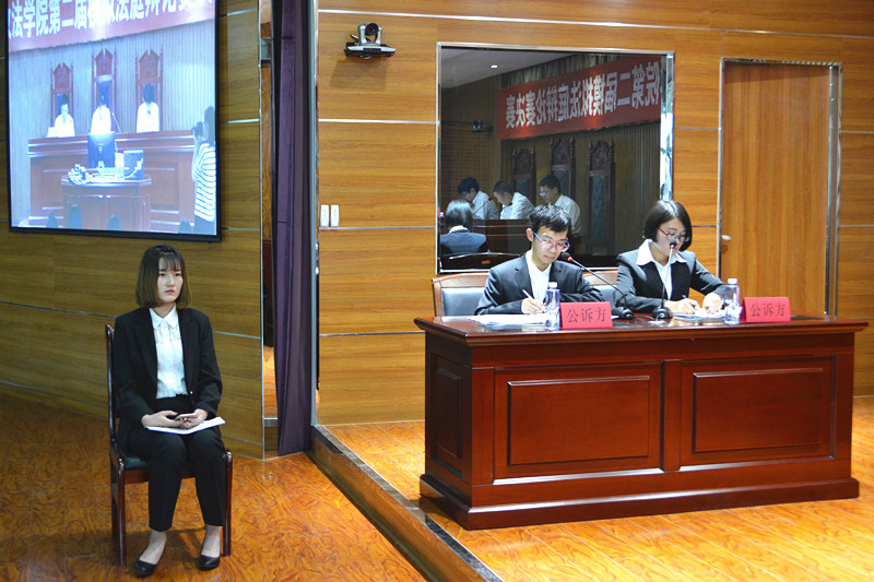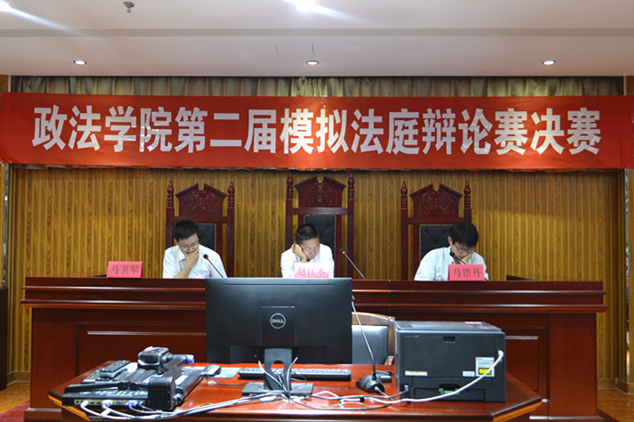 模拟法庭竞赛决赛。学院法律系赵江水老师、马卫军老师、马浩丹老师受邀出席并担任合议庭评审员。2016级法学专业全体学生观摩学习了比赛。