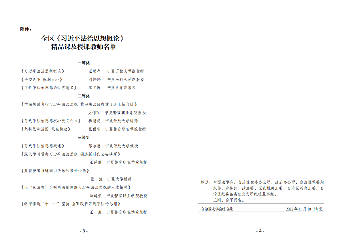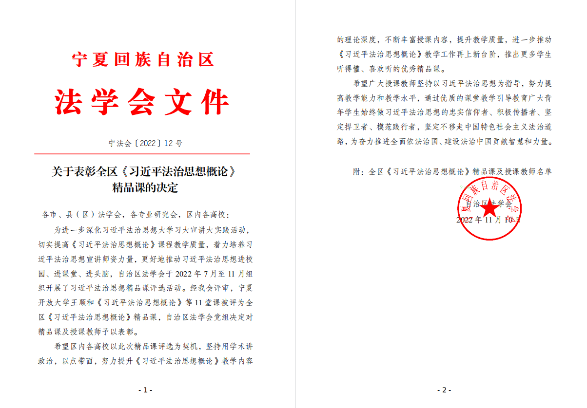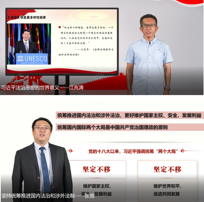 江兆涛老师主讲的《习近平法治思想的世界意义》视频课获得一等奖、张弛老师主讲的《坚持统筹推荐国内法治与涉外法治》获得三等奖。学院高度重视《习近平法治思想概论》教学工作,法律系教工党支部引导党员教师从专业课的角度系统学习、研究习近平法治思想,实现习近平法治思想与各门法学专业课程有机融合,增加运用研讨式、案例式、情景模拟式等互动式教学方法的课堂,把社会主义法治国家建设实践的最新经验和生动案例带进课堂教学。