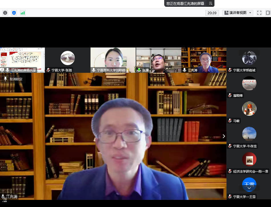 江兆涛代表学院在交流发言中从如下几个方面分享了自己的备课和学习心得:首先,尽可能拓宽自己的视野,丰富自己的知识储备,特别要丰富习近平新时代中国特色社会主义思想知识、“四史”知识以及时政新闻等知识。知识储备丰富了,有助于通过生动、深入、具体的纵横比较,把习近平法治思想讲明白、讲清楚;其次,精研教材,选好中国法治故事,在精研教材的基础上,尽量选取新近发生的、学生心理上更容易产生共鸣的中国法治故事,能达到更佳教学效果;第三,以学生为中心,讲好中国法治故事,坚持以学生为中心的教学理念,根据学生正处于成长阶段的身心特点以及当今社会是信息时代的特点,以“多姿多彩”的授课方式,讲好中国法治故事;第四,发挥学生主体作用,引导学生释放自我教育活力,教师可探索多种形式的课堂实践,将专业小课堂同社会大课堂结合起来,充分发挥学生主体作用,引导学生释放自我教育活力;第五,注重与学生的情感共鸣,作为教师,一方面自己首先要对习近平法治思想“真学、真信、真教”,另一方面要注重以平等的态度通过多种方式与学生交心互动,以自身言行感召学生亲师信道,自觉做习近平法治思想的坚定信仰者、积极传播者、模范践行者。