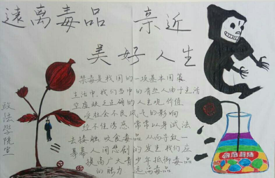 “远离毒品亲近美好人生”的展板宣传,以罂粟花下的死魂灵,张牙舞爪的死神和盛着合成毒品的瓶子生动形象地说明了毒品之于人类生命的重大危害,并借以文字直接具体地说明了禁毒的必要性与重要性。