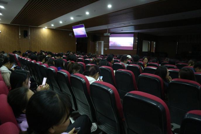在模拟法庭组织观看禁毒教育宣传片,2019级全体学生到场观看。