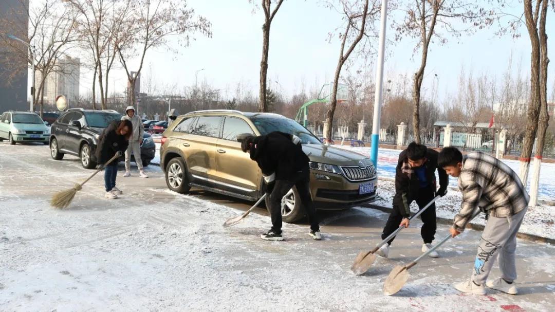 大家不畏严寒,挥动铁锹,舞动扫帚,校园的各个角落都留下了同学们辛勤扫雪的身影,扫雪大军为校园增添了一道靓丽的风景线,也给寒冷的冬日校园带来了不少温暖。寒风凛冽,天冷路滑,“众人拾柴火焰高”,原本看起来十分繁重的任务在大家齐心协力的努力下高效完成。