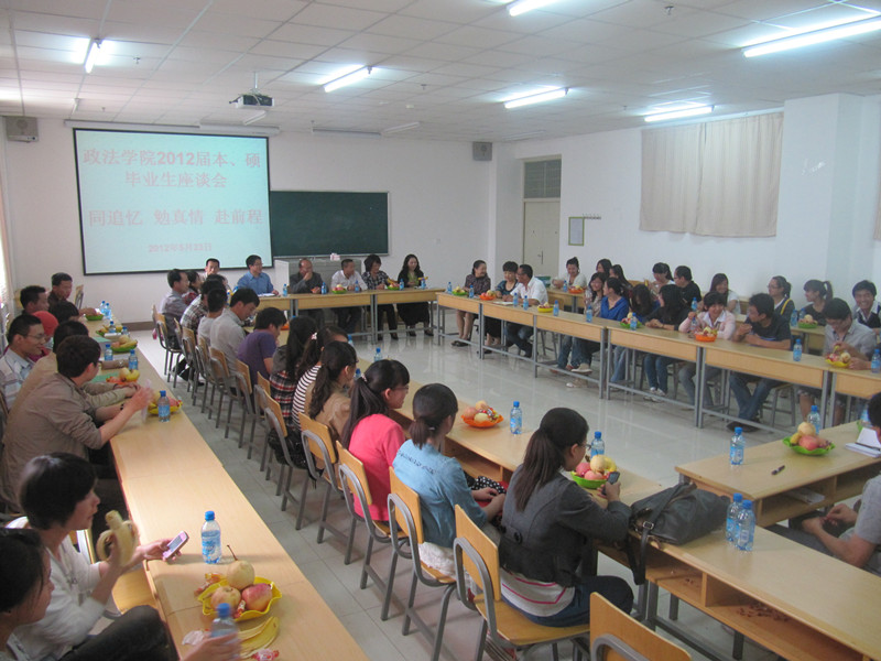 “同追忆、勉真情、赴前程”本、硕毕业生座谈会在文科楼418教举行。学院院长潘忠宇、副院长吕耀军、副院长曲正、教科办主任武玲娥、政治系主任潘素洁、行管系主任杨文林、法律系滕明荣教授、学生办公室主任张强以及部分本、硕毕业生参加了座谈会。此次座谈会由学院党总支副书记崔明堂主持。