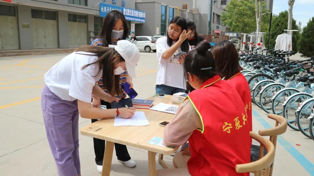 贺兰山校区兰馨苑餐厅门口举办“爱满人间,情暖人心”图书捐献活动。