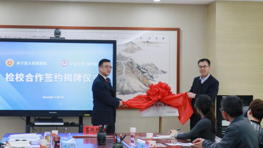 为创新法治人才培养机制,促进法学理论与实践深度融合,11月5日,宁夏大学法学院与永宁县人民检察院举行检校合作签约揭牌仪式,永宁县人民检察院党组书记、检察长董林,党组副书记、副检察长郭子华,党组成员、第二检察部主任马易东,党组成员、政治部主任薛吟,第三检察部主任杨玉婕及干警代表参加仪式,宁夏大学法学院党总支书记李治涛,院长吕耀军,法律系主任朱蓓予,法律系教师曹慈义,江兆涛,何磊,胡晓莉等参加活动。永宁县人民检察院党组成员、副检察长朱向全主持会议。