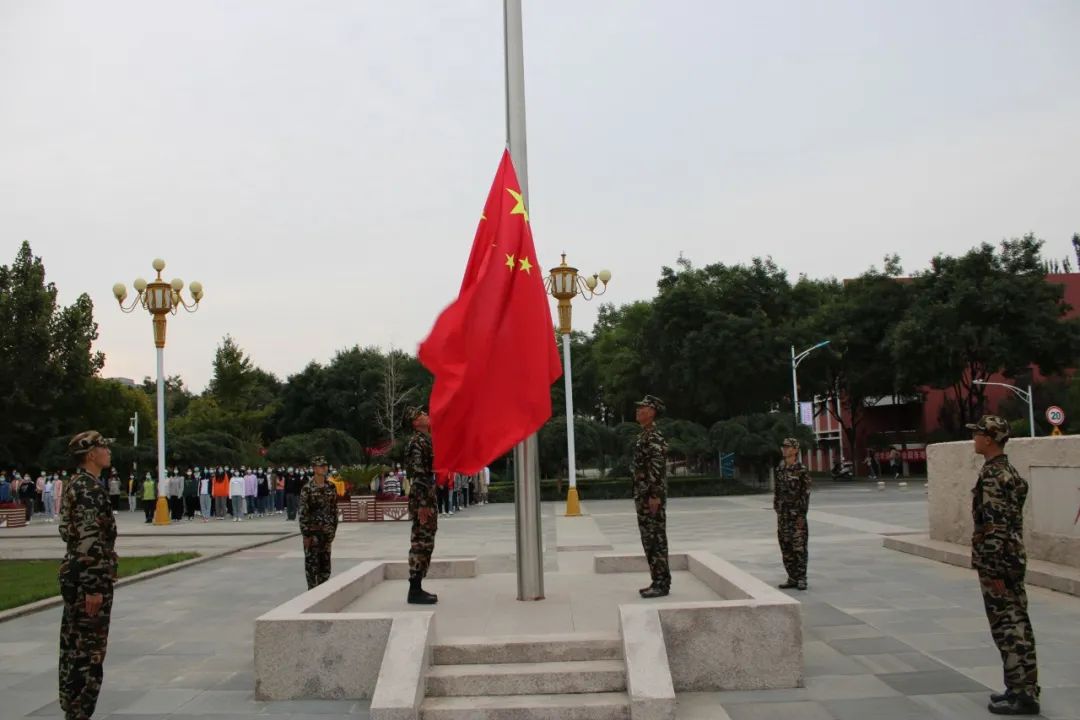 升旗仪式开始,在师生的热切注目下,国旗护卫队迈着铿锵有力的步伐,表情专注而坚定,庄严地护卫国旗入场。随着指挥员“升国旗”的口令,国歌奏响,旗手奋力将国旗展向天空,鲜艳的五星红旗荡出优美的弧线,迎着初升的朝阳冉冉升起。