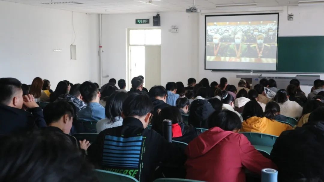 在文荟楼342教室组织2020级法学一班、2019级法学一班、2018级行政管理班和社会学班的同学观看“纪念人民志愿军抗美援朝出国作战七十周年大会”的直播。