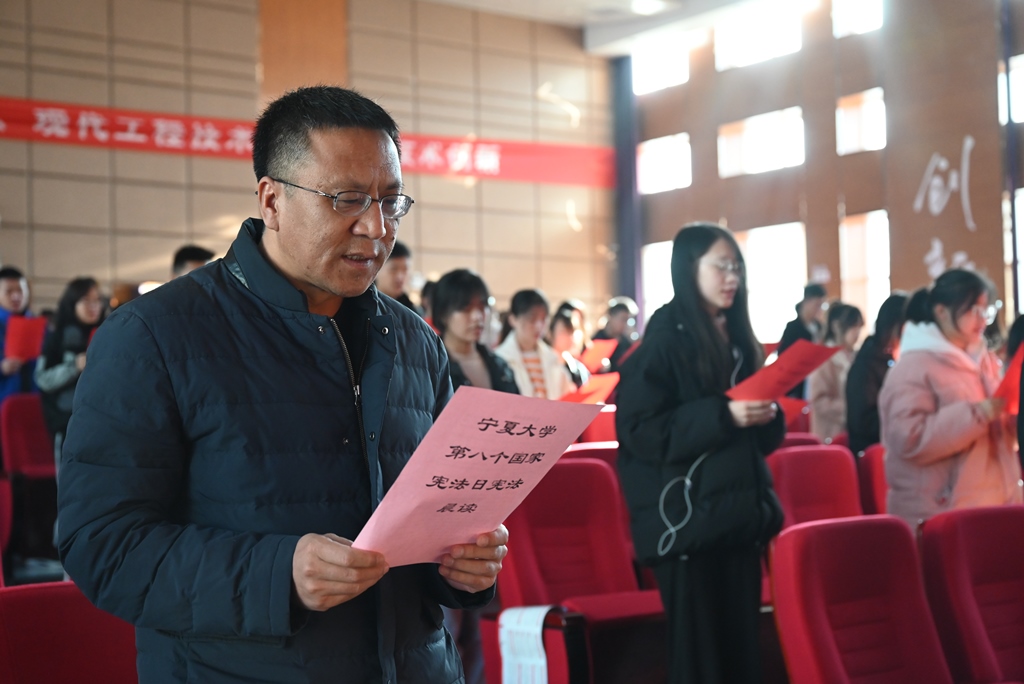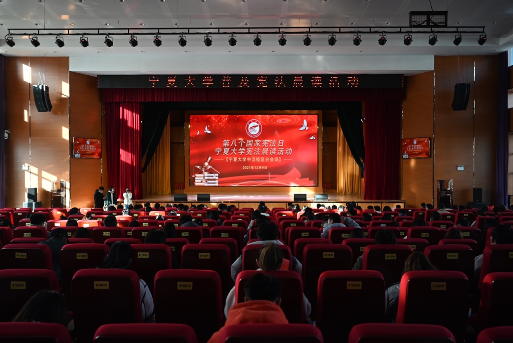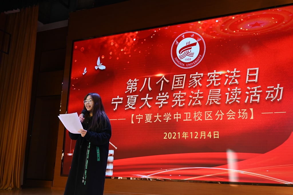 活动伊始,首先由绅士漫画 战奇同学带来全国学生学宪法讲宪法获奖作品《习近平法治思想深刻阐释了中国特色社会主义宪法道路的根本方向与独特优势》的演讲展示。之后由绅士漫画 、文化旅游学院、商学院、智能工程与技术学院的四名学生代表进行领读,来自四个学院的三百余名师生在中卫校区应理报告厅齐声诵读宪法。师生们庄严而整齐的声音,铿锵有力,字字入心。