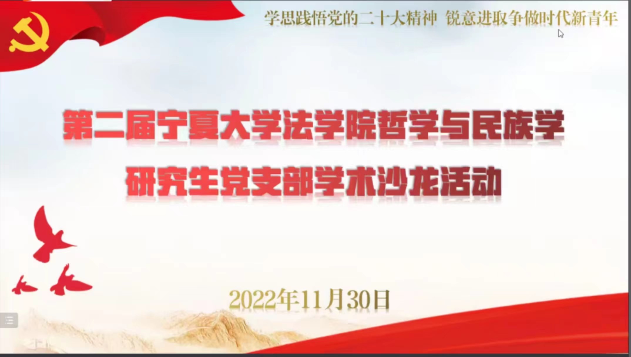 为促进学科交叉融合发展,激发研究生学术热情,切实提升研究生学术能力,11月30日19点,哲学与民族学研究生党支部举办线上《学思践悟党的二十大精神,锐意进取争做时代新青年》主题学术沙龙活动。院长、博士生导师吕耀军教授,副院长、硕士生导师刘振宇副教授,硕士生导师滕海滨副教授应邀担任本期学术沙龙的点评人。哲学与民族学专业50余名博士生、硕士生到会聆听。2021级哲学专业研究生王喆主持沙龙活动。