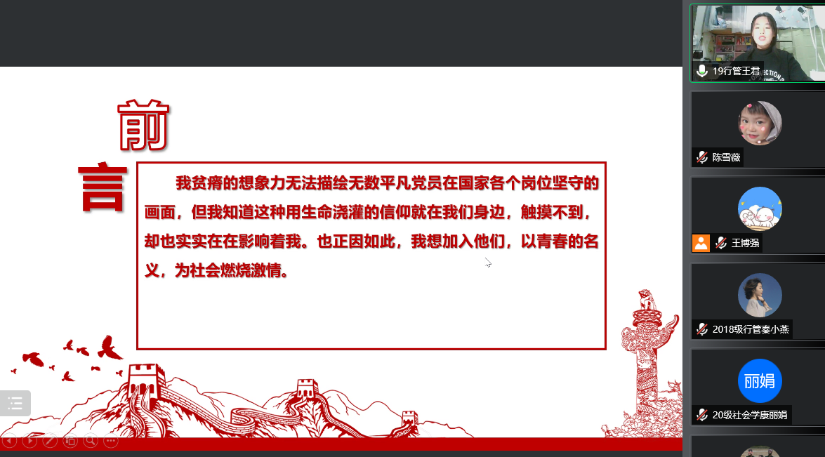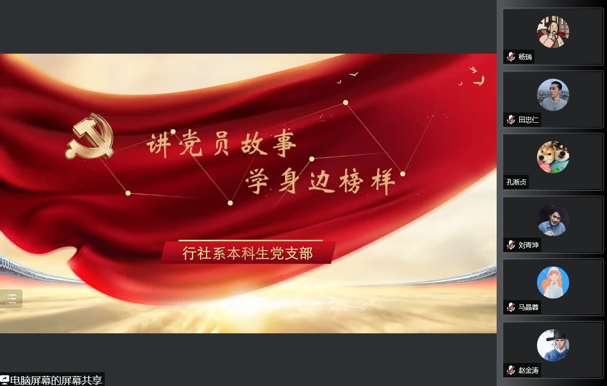 为加强业余党校学员党性修养,做好发展对象的培训工作,按照学院党委的相关要求,11月10日晚,行社系本科生党支部组织召开了发展对象考核汇报会“讲述身边党员的故事”暨线上群众座谈会。党支部书记武玲娥、支部全体党员、支部第十四期发展对象参加此次会议。会议由支部宣传委员陈雪薇主持。