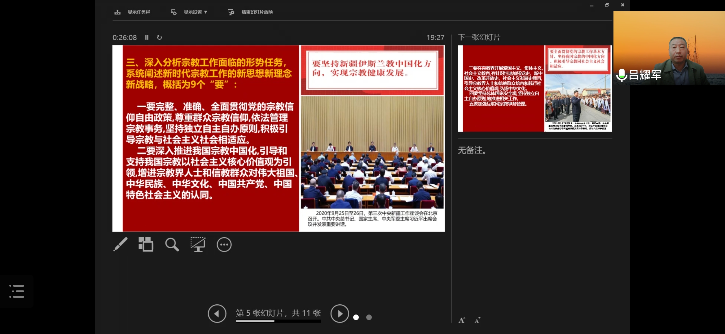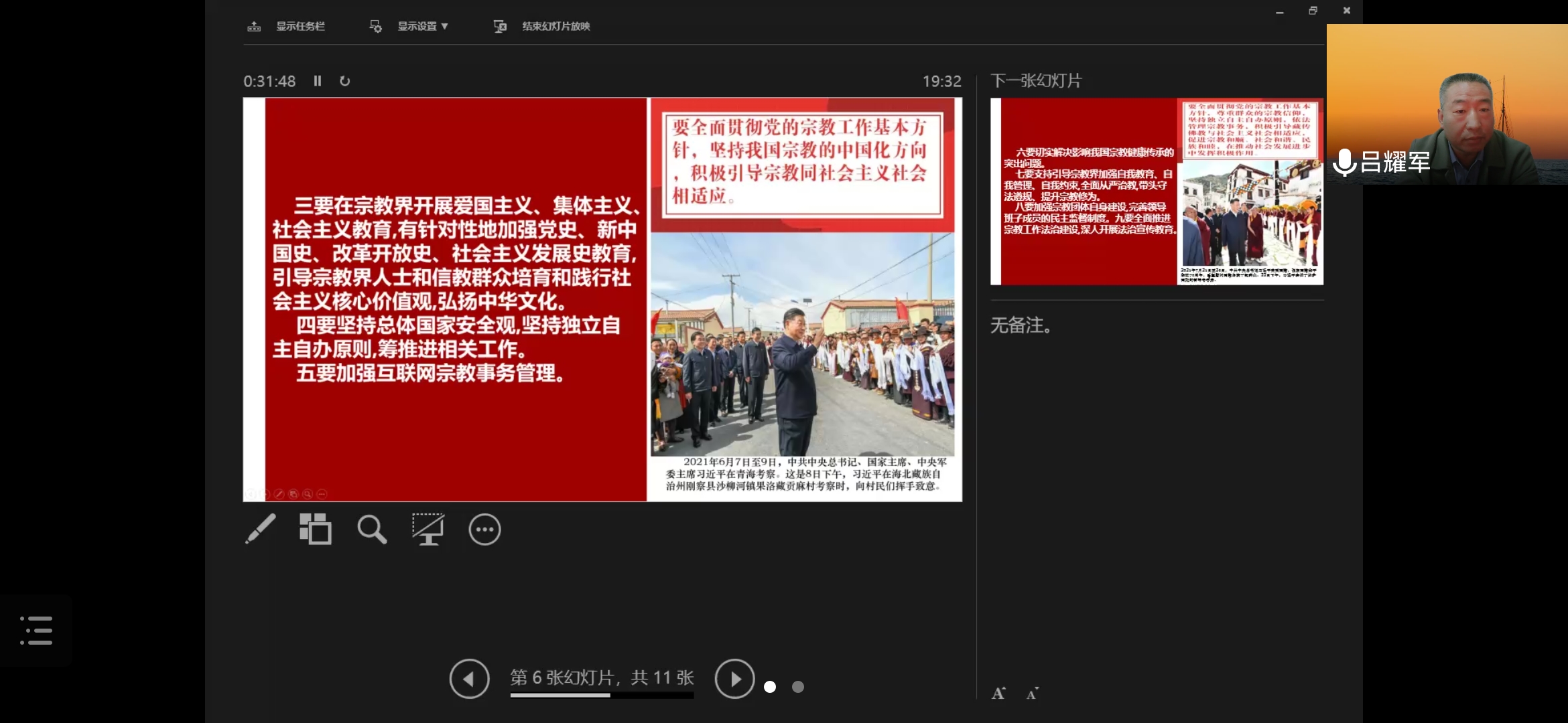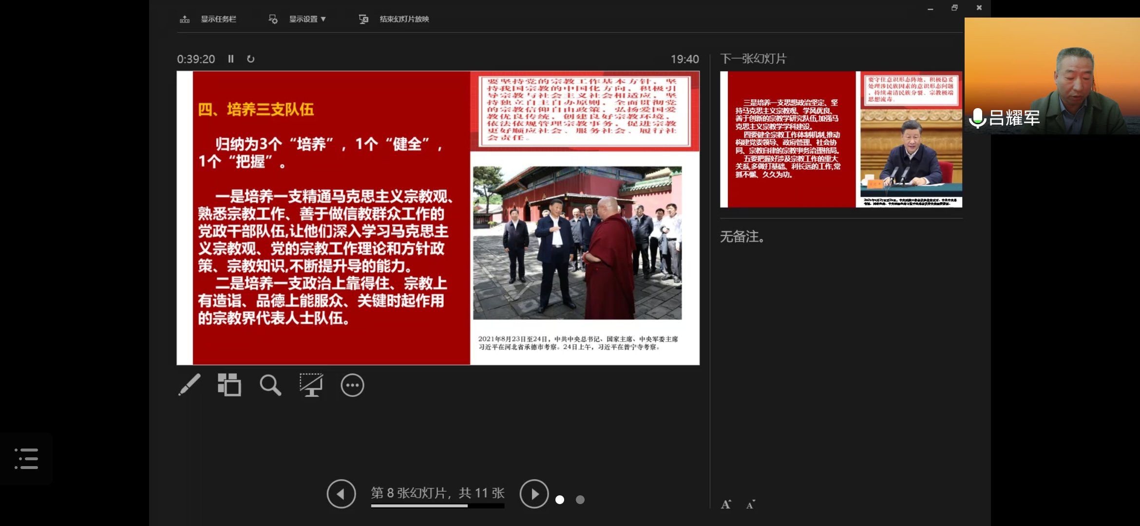 此次讲座,吕耀军就如何坚持我国宗教中国化方向,积极引导宗教与社会主义社会相适应进行了详细的讲解。讲座内容共分为四个部分:一是党的宗教工作取得积极成效。各级党委对于党中央政策的贯彻落实,使宗教工作体制机制得到进一步完善;二是全面总结宗教工作的经验。古人云:温顾而知新。通过对过去宗教工作的回顾,总结出了9个“必须”,又以这9个“必须”来确定未来宗教工作的发展方向;三是深入分析宗教工作面临的形势,系统阐述新时代宗教工作的新理念新思想新战略,概括为9个“要”;四是培养三支队伍。要分别培养党政干部队伍、宗教界代表人士队伍、宗教学研究队伍,加快宗教工作的进一步落实完善。