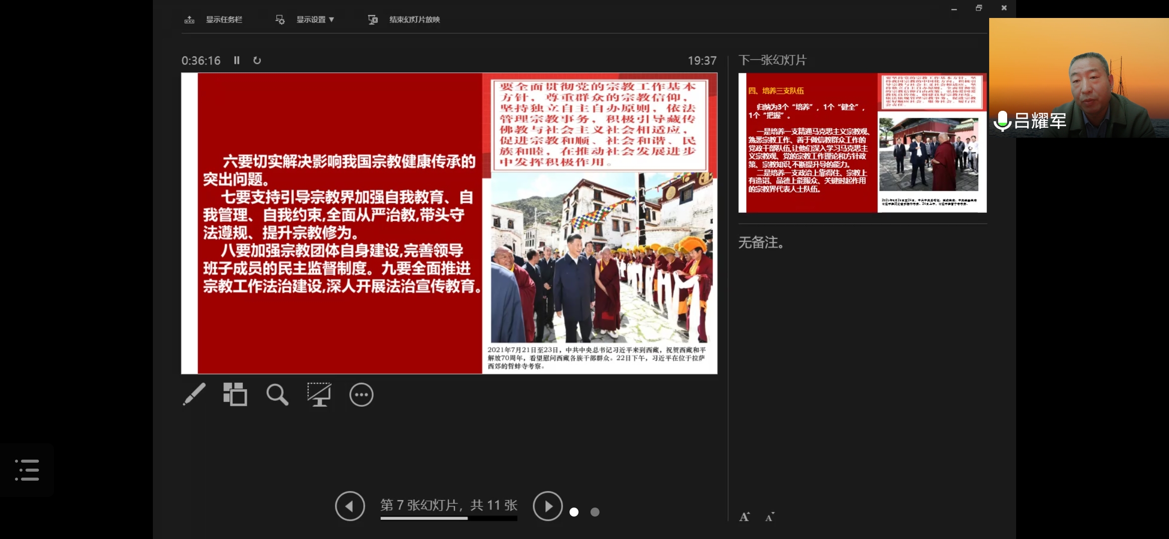 4月18日晚,院长吕耀军为学院分党校第四十一期入党积极分子培训班、第十五期发展对象培训班和第十四期“青年马克思主义者培养工程”暨团学骨干培训班学员于线上开展以“2021年全国宗教工作会议精神解读”为主题的党课,全体培训班学员参加。