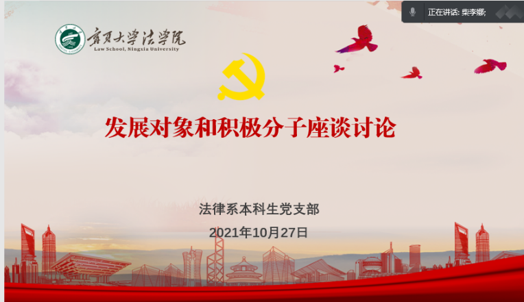 为提高党员发展对象、积极分子政治素质,端正入党动机,坚定理想信念,10月27日晚,法律系本科生党支部召开线上座谈会。法律系本科生党支部书记王嘉豫、支部支委,支部第十四期发展对象、第四十期积极分子参加会议。此次座谈会由组织委员柴李娜主持。