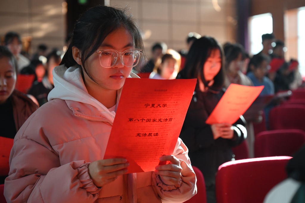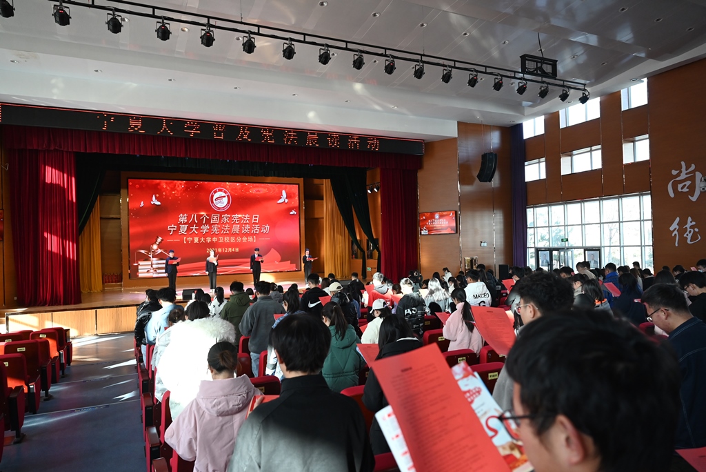 活动伊始,首先由绅士漫画 战奇同学带来全国学生学宪法讲宪法获奖作品《习近平法治思想深刻阐释了中国特色社会主义宪法道路的根本方向与独特优势》的演讲展示。之后由绅士漫画 、文化旅游学院、商学院、智能工程与技术学院的四名学生代表进行领读,来自四个学院的三百余名师生在中卫校区应理报告厅齐声诵读宪法。师生们庄严而整齐的声音,铿锵有力,字字入心。