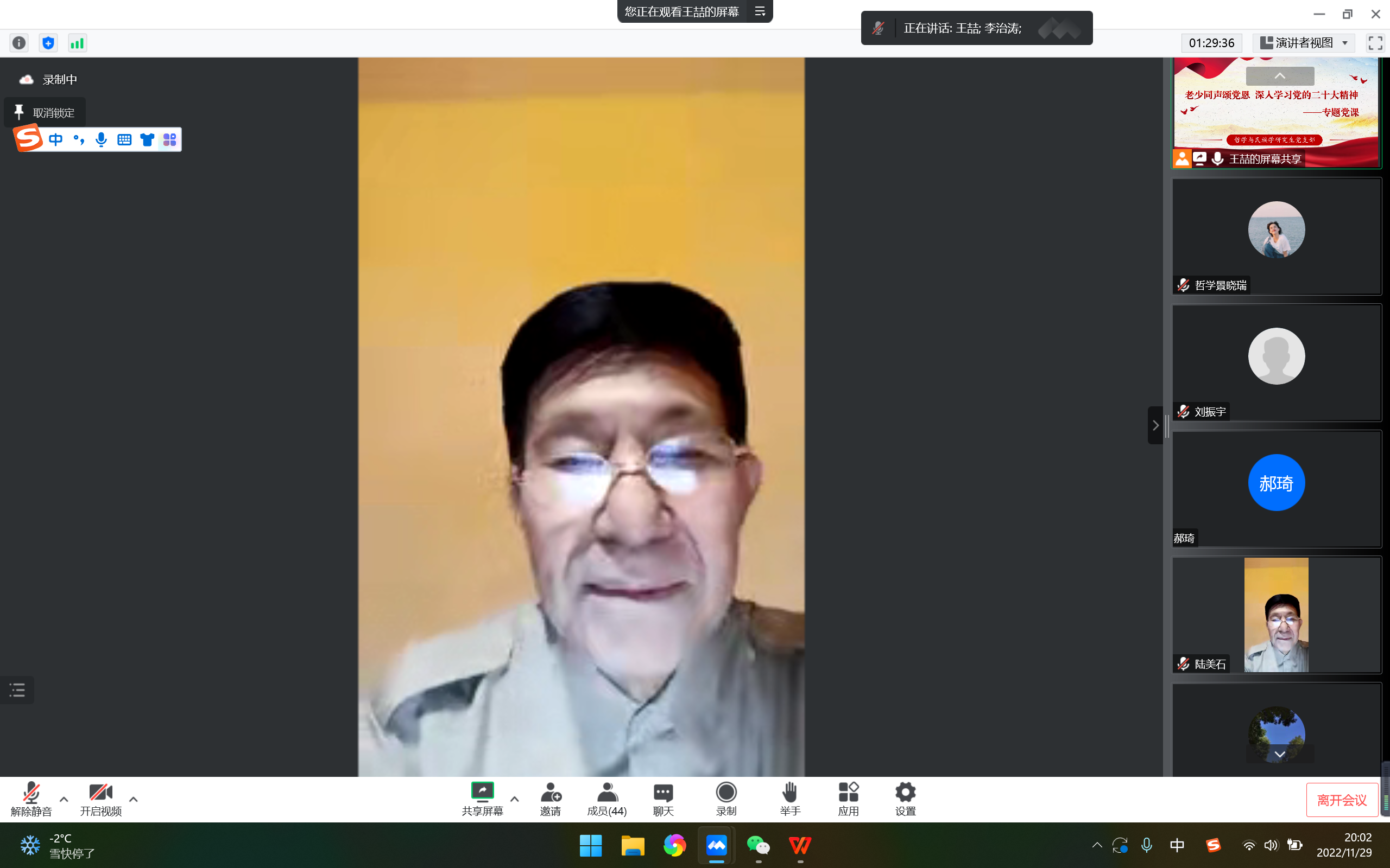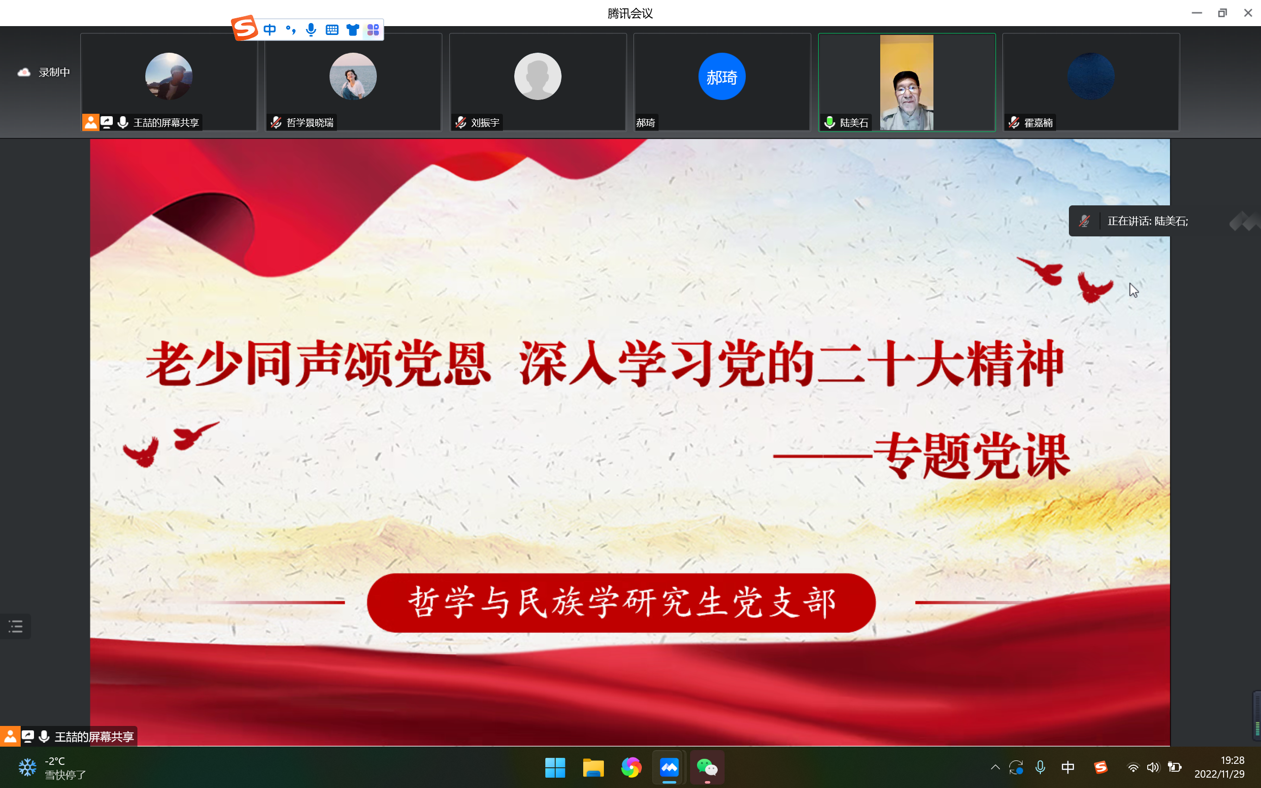 为进一步增强支部党员党性修养,深入学习党的二十大精神,11月29日晚7点,哲学与民族学研究生党支部以线上形式,召开“老少同声颂党恩,深入学习党的二十大精神”专题党课。学院党委书记李治涛,党委委员、副院长刘振宇,绅士漫画 关工委副主任、关工委“五老”报告团团长陆美石应邀参加,支部全体党员、发展对象和入党积极分子共同学习。会议由支部组织委员王喆主持。