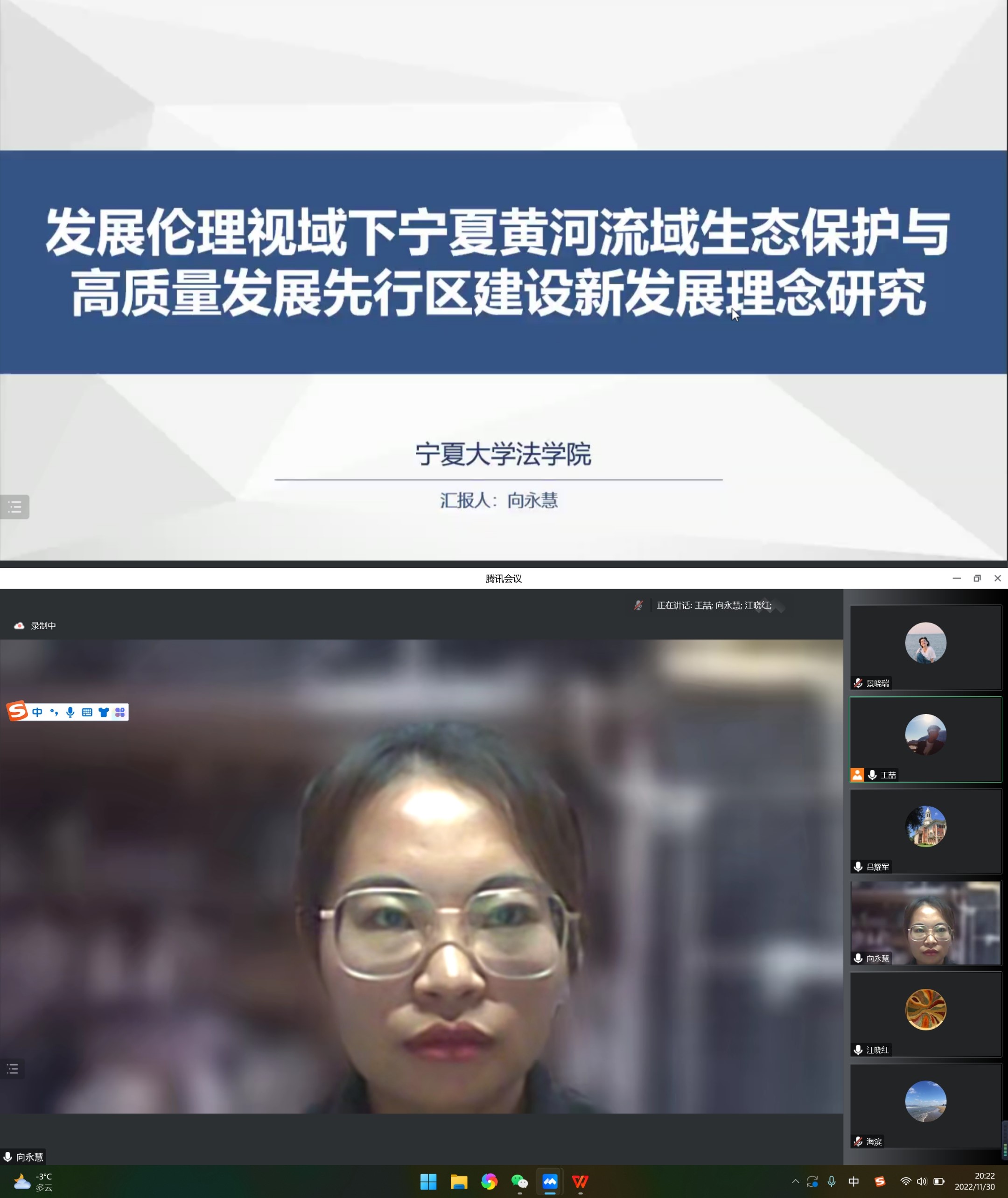2020级伦理学专业硕士研究生向永慧分享的主题是《发展伦理视域下宁夏黄河流域生态保护和高质量发展先行区建设新发展理念研究》。向永慧从多个角度进行叙述,阐述了先行区建设中贯彻新发展理念的现实意义。创新发展体现人道主义本质,是以人民为中心的发展,发挥道德责任巨大的功能;协调发展统筹持续健康全局,反映公平与和谐的社会意义;绿色发展维护人与自然和谐,实现发展方式的根本性变革;开放发展推动世界和谐共赢,要有面向全球的观点;共享发展促进社会公平正义,重视社会成员共享的权利,体现公平正义的原则。
